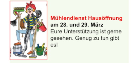 | 28.03.2026 - 10:00 - Mühlendienst Hausöffnung | Naturfreundehaus Günthersmühle | Biebergemünd-Kassel | |