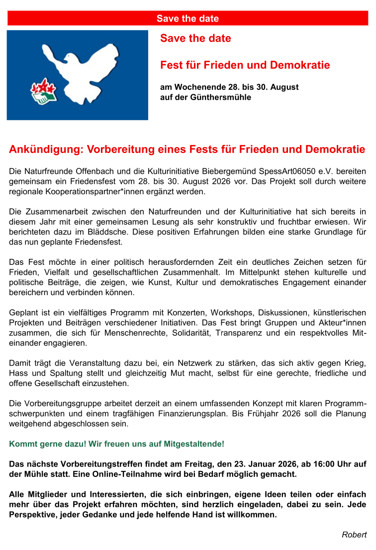 | 23.01.2026 - 16:00 - Vorbereitungstreffen für "Fest für Frieden und Demokratie" | Naturfreundehaus Günthersmühle | Biebergemünd-Kassel | |