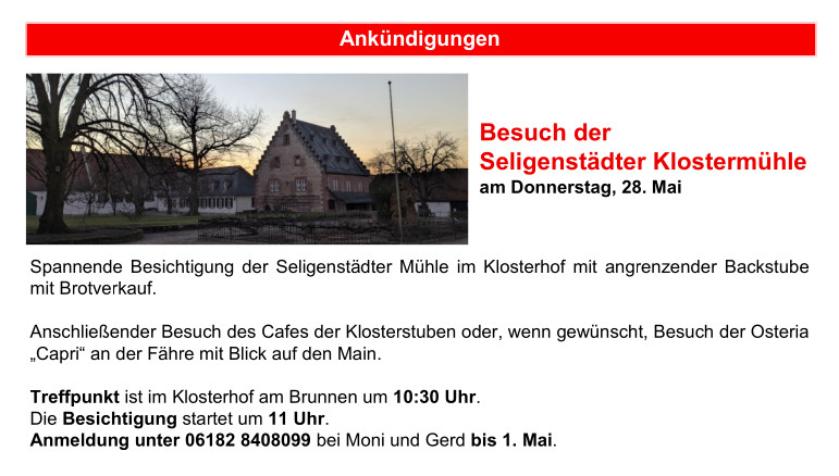 | 28.05.2026 - 10:30 - Besuch der Seligenstädter Klostermühle | Seligenstadt | | |